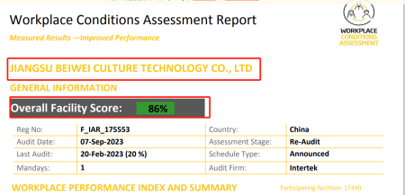 在創(chuàng)思維驗(yàn)廠(chǎng)網(wǎng)老師專(zhuān)業(yè)技術(shù)、全程跟進(jìn)耐心細(xì)致輔導(dǎo)以及公司全體員工配合下,一次性順利通過(guò)ITS-WCA驗(yàn)廠(chǎng),為將來(lái)公司發(fā)展奠定了良好的發(fā)展基礎(chǔ),既開(kāi)拓了市場(chǎng)同時(shí)也增加了消費(fèi)者對(duì)公司的信賴(lài),在這里再次祝賀江蘇百威文化科技有限公司2023年一次性成功通過(guò)ITS-WCA驗(yàn)廠(chǎng),同時(shí)也期待未來(lái)再次與創(chuàng)思維驗(yàn)廠(chǎng)網(wǎng)合作!